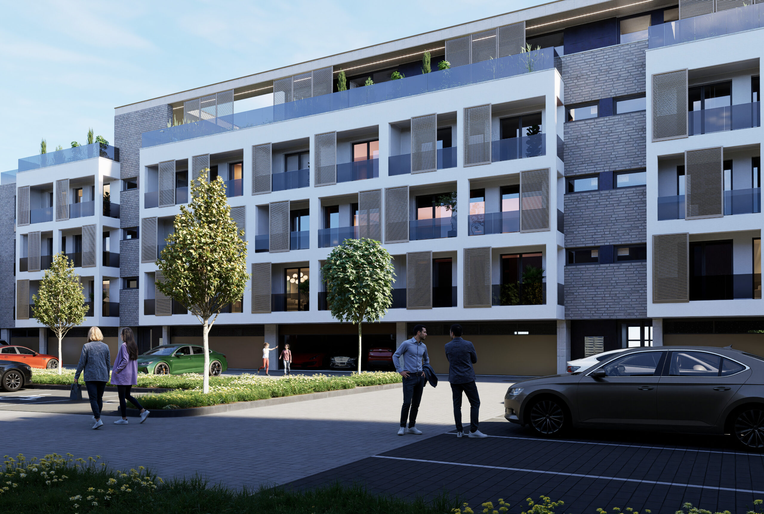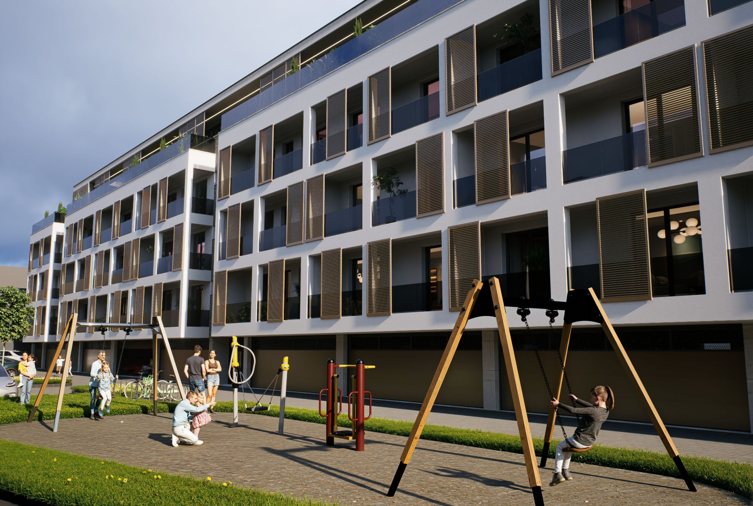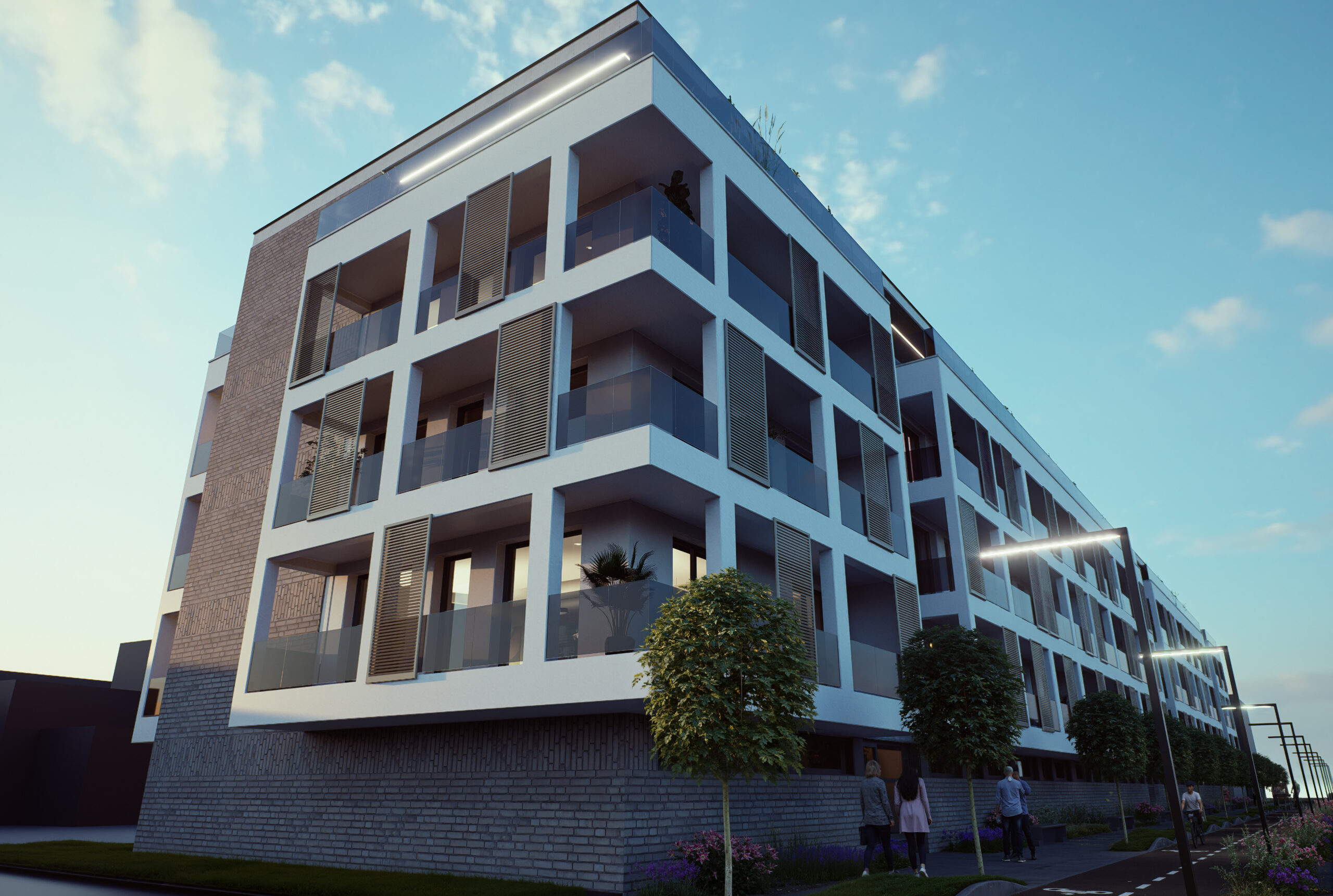 Charakter fasád stojí na kontraste pevného parteru a ľahších obytných vrstiev. Dominantným prvkom sú loggie orientované do najviac exponovaných strán, ktoré prinášajú svetlo, výhľady a kontakt s exteriérom. Loggie dopĺňa posuvný lamelový systém, ktorý vytvára prirodzené tienenie, súkromie a zároveň dáva fasáde dynamiku – dom pôsobí „živšie“ v závislosti od nastavenia lamiel.